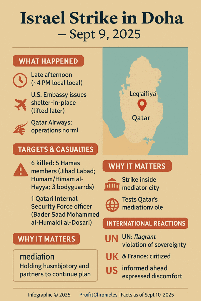 Doha, Sept 2025 — The Israel strike in Doha hit Leqtaifiya/West Bay Lagoon in the late afternoon as Hamas leaders met to weigh a U.S. ceasefire/hostage proposal. It was the first known Israeli attack on Qatari soil, shattering the calm of a diplomatic hub and raising urgent questions about whether the Gulf’s premier mediator can keep talks alive.