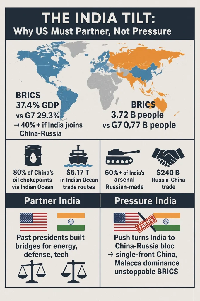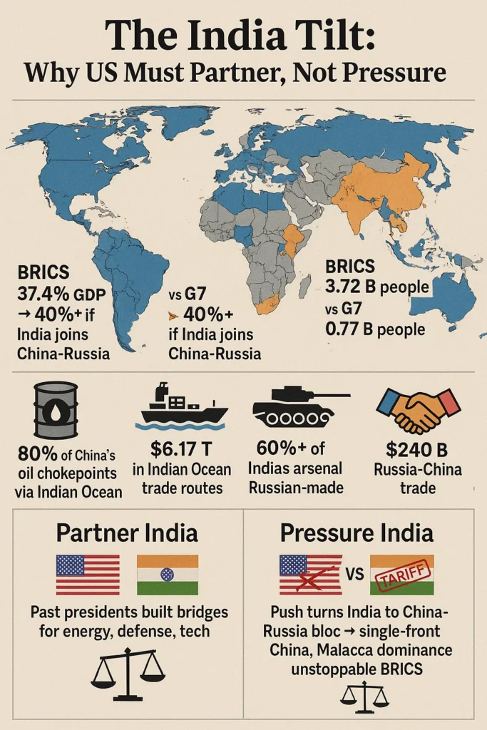 Malacca Strait Mastery: China fears the “Malacca Dilemma”—80% of its oil passes through chokepoints flanked by India. Hand India to Beijing and you gift-wrap global black gold on a platter.